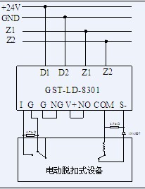 1.模塊通過有源輸出直接驅(qū)動一臺排煙口或防火閥等(電動脫扣式)設(shè)備的接線示意圖如圖2- 33 (無源常開檢線輸入)、圖2- 34所示(無源常閉檢線輸入):